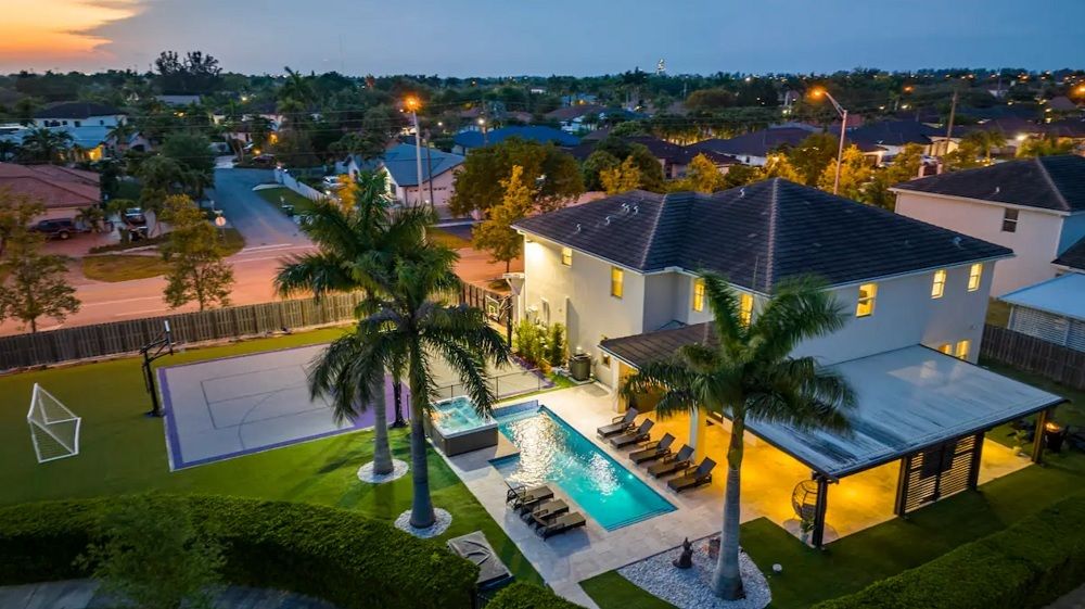 If you have a large or multi-family situation and don't want to have to plan much, consider this 8-bedroom, 5-bath mansion that's just 15 minutes from MIA airport. With a covered patio, heated pool, basketball court, soccer field, and (of course) a private pickleball court, it's a sure bet for a convenient, fun, warm-weather Airbnb with a pickleball court.