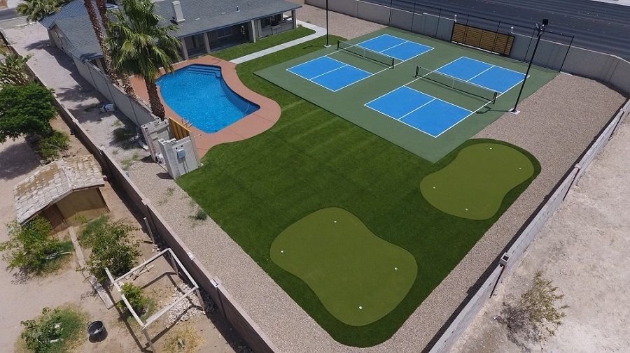 The Pickle BnB is a pickleball haven in Las Vegas, NV that's 5 minutes from the airport and 15 minutes from the strip. This 3-bed, 2-bath home is centrally located among grocery stores, 24-hr pharmacies, and restaurants. Features include two full-size pickleball courts, two putting greens, a large pool, a game room with pool table and bar, and space to sleep 6-8 comfortably.