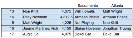 Noe is looking like the favorite out of the five. Riley hoping a new partnership with Armaan keeps him in the top 16. Matt Wright is likely to drop out of the top 16 because he isn’t playing Sacramento, but Noe in Atlanta is a great partner, so he could stay. Jaume has two good partners and Augie is taking a risk by partnering with Dekel. I think Wright skipping Sacramento will cause him to drop out of the top 16.