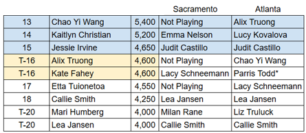 Out of those last three spots, I think Catherine is for sure going to make it, and Tina looks like she will as well. Truong is essentially out of it, as she is the only one not playing Sacramento (stress fracture). I think the woman who finishes best between Parris, Rachel, and Kate in Atlanta takes that last spot.