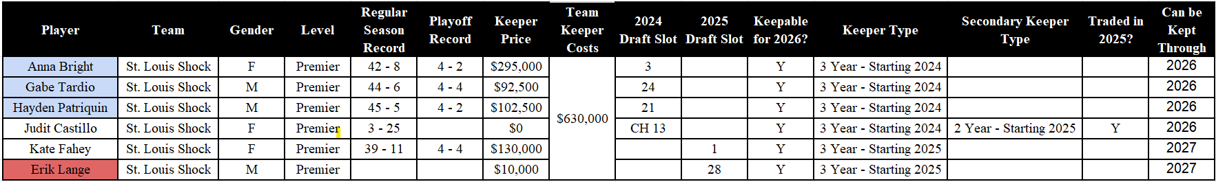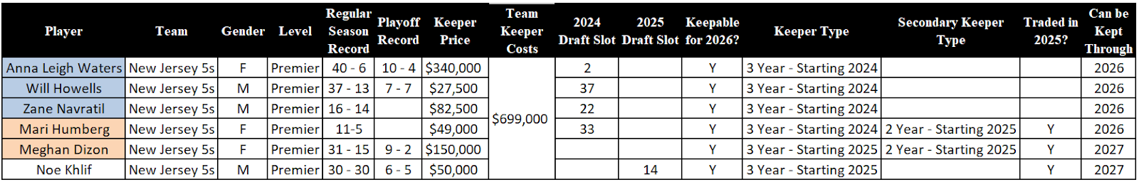 Speaking of keeper costs, this is one of the most complicated items in MLP for the fans to understand. As a reminder, the teams themselves do NOT pay the players, the league pays the players. However, in order to keep players, teams must pay the league a “keeper fee” for each player. This keeper fee is NOT tied to a player’s salary, it just how much money needs to be paid to the league from the team.