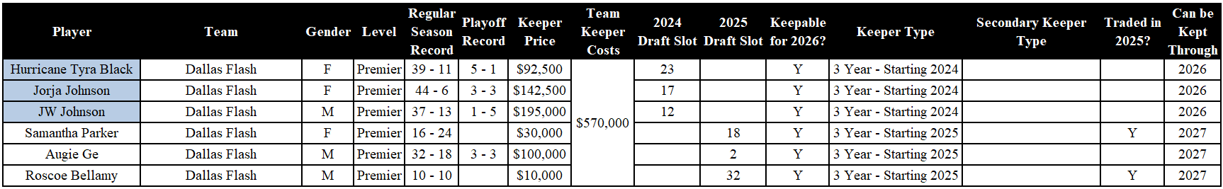 Analysis: The Flash can keep Bellamy, Parker, and Ge through the 2027 season, because they were drafted in 2025. The Flash have a tough decision to make on their three stars - between Hurricane Tyra Black, JW Johsnon, and Jorja Johnson, which one do they drop or trade? Dallas showed it was willing to put up some money to bring the crew back together after 2024, by paying $100k for Ge. Will they just do the same with Black? Or will they make some other move?