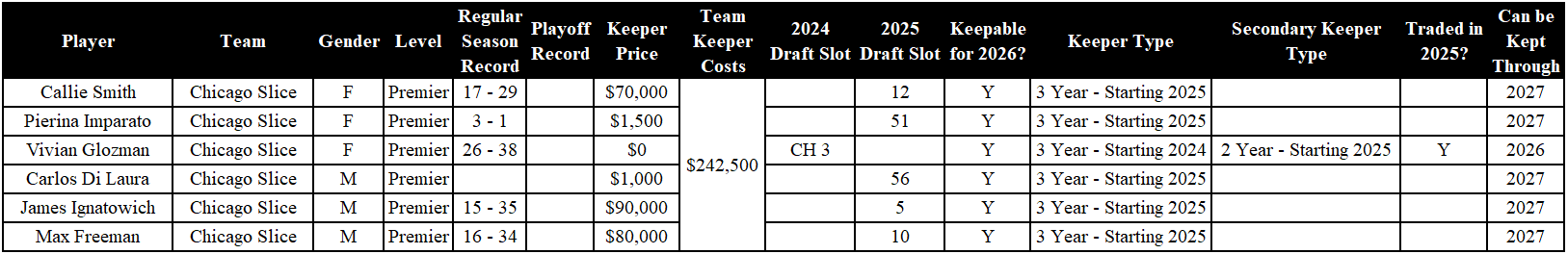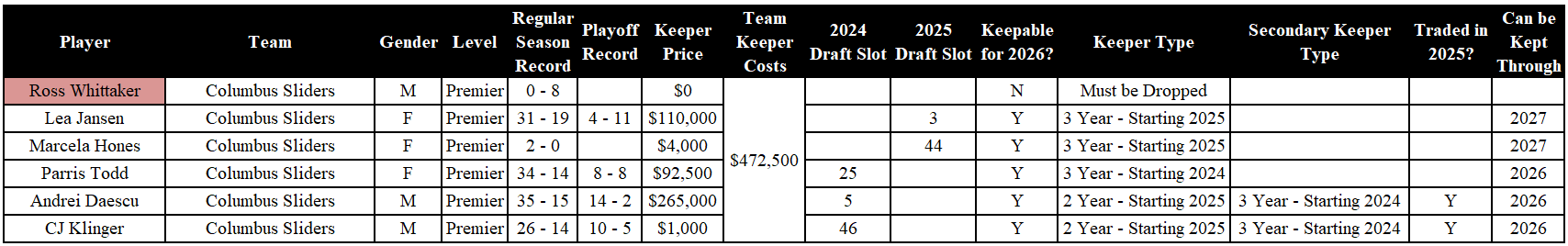 Analysis: The 2025 MLP Champions only have to drop Ross Whittaker before the 2026 season. He was picked up via waivers (and very well could be picked back up by Columbus, as he is an Ohio native). Lea and ‘Cela were drafted in 2025 and can be kept through 2027. The Sliders can name Parris and either Andrei or CJ as their two, three-year keepers. Between CJ and Andrei, whichever is not designated as a three-year keeper, can be designated as the Sliders’ two-year keeper.