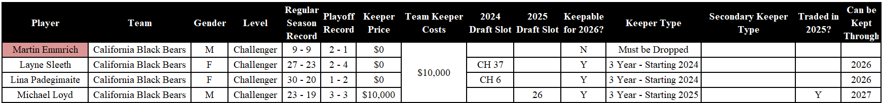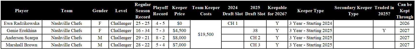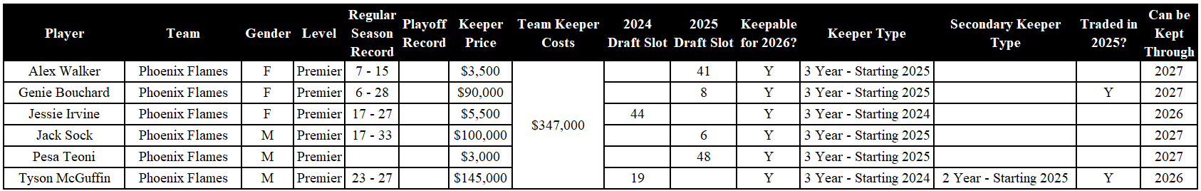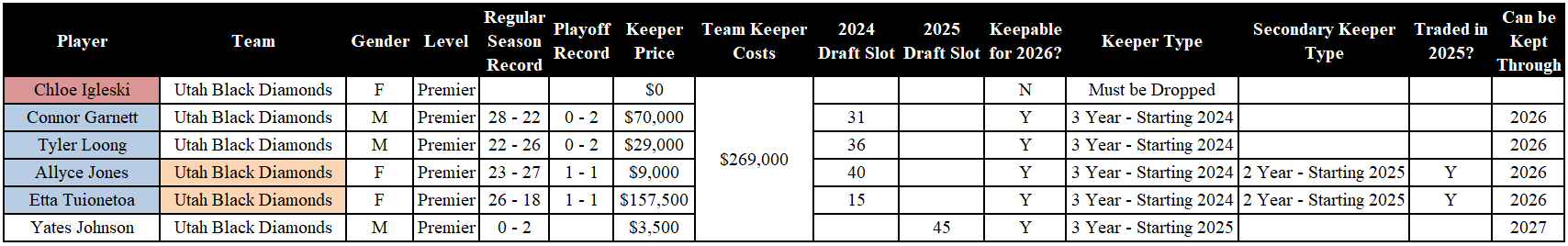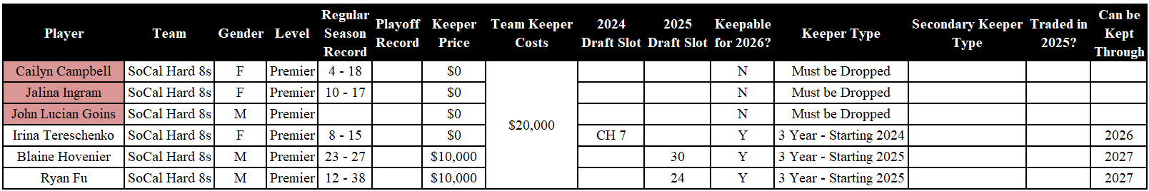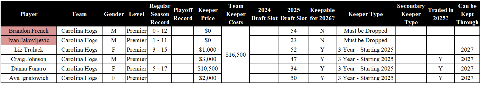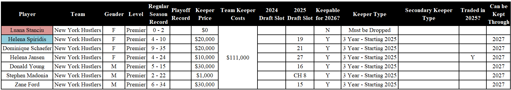 Analysis: The Hard Eights had a rough 2025 season, and picked up Campbell, Ingram, and Goins in waivers. All three of the teenagers must be dropped. Irina is a three-year keeper from 2024. Fu and Hovenier are eligible to be kept through the 2027 year.