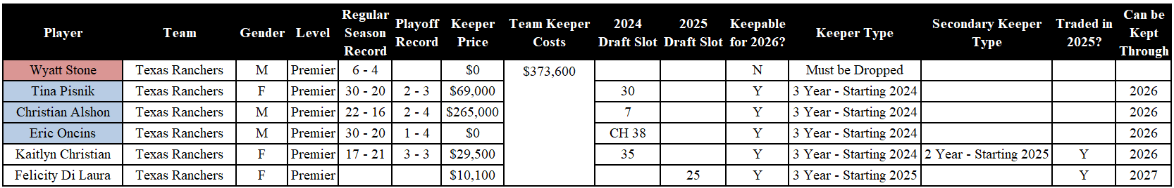 Analysis: The Ranchers have to drop Wyatt Stone, as he was selected in waivers. Di Laura can be kept through 2027. Kaitlyn Christian can be kept as the only two-year keeper. There are only two roster spots for three-year keepers, and there are three players eligible: Pisnik, Alshon, and Oncins. It seems like the Ranchers have a lot of options here.