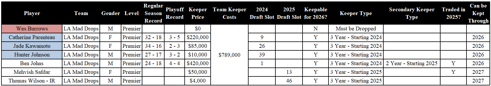 Analysis: The Mad Drops have seven roster spots due to rostering Thomas Wilson in their IR spot. Wes Burrows must be dropped as he was picked up off of waivers once Wilson was placed on IR. Safdar was drafted in 2025, so she can be kept through 2027.