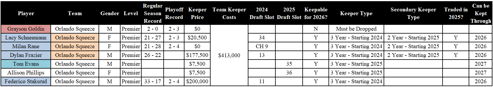 The complication comes with their keepers. Four players (Schneemann, Rane, Frazier, and Staksrud) are eligible to be kept as a three-year keeper, but the Squeeze only has two of those roster spots. On top of this, Schneemann, Rane, and Frazier could all be considered for the two-year keeper spot. Essentially, Orlando is going to have to drop one of their four starters.