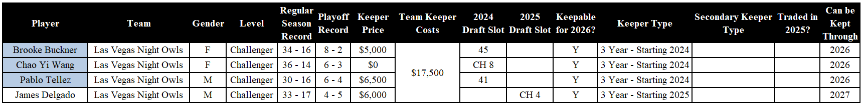 Analysis: The 2025 Challenger Level Champions have to make a decision on which two players to keep, from this list: Buckner, Wang, and Tellez. Delgado was drafted in 2025, and therefore they can keep him through 2027. This decision is even tougher as the Night Owls are the only team moving up into the Premier Level in 2026.