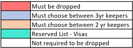 This article is meant to outline the decisions that are going to be forced on teams, due to the keeper/drop rules. This is NOT an article explaining what I believe each team will do in the off season - there are way too many trade options, drop options, and rules to rewrite between now and then.