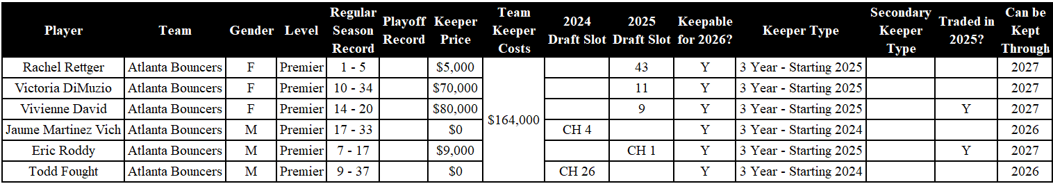 Analysis: The Atlanta Bouncers are not going to be forced to drop any players. Rettger and DiMuzio were drafted by the Bouncers in 2025. Both David and Roddy were also drafted in 2025, and traded to the Bouncers during the year, so they can be kept through 2027. The two original players from the Bouncers’ 2024 draft are Jaume Martinez Vich and Todd Fought. Both can be kept as three-year keepers.