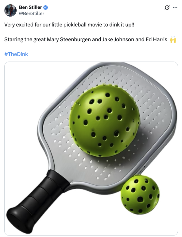 Ben Stiller is even posting on X about it, using a familiar hashtag and some questionable stock pickleball art :