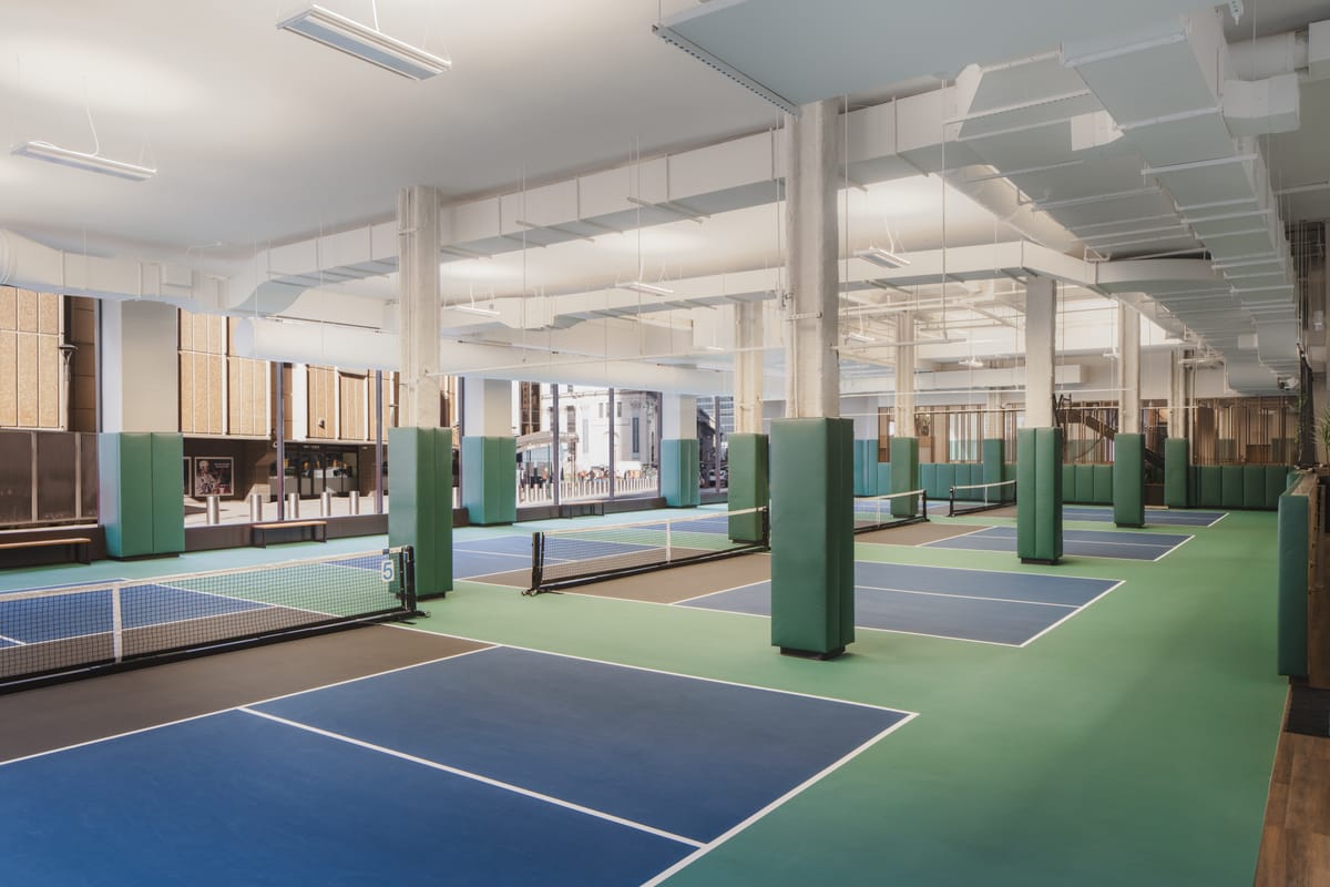PKLYN is a pickleball club and community gathering space located in Brooklyn, inside a spacious, light-filled warehouse with 23-foot-high ceilings.