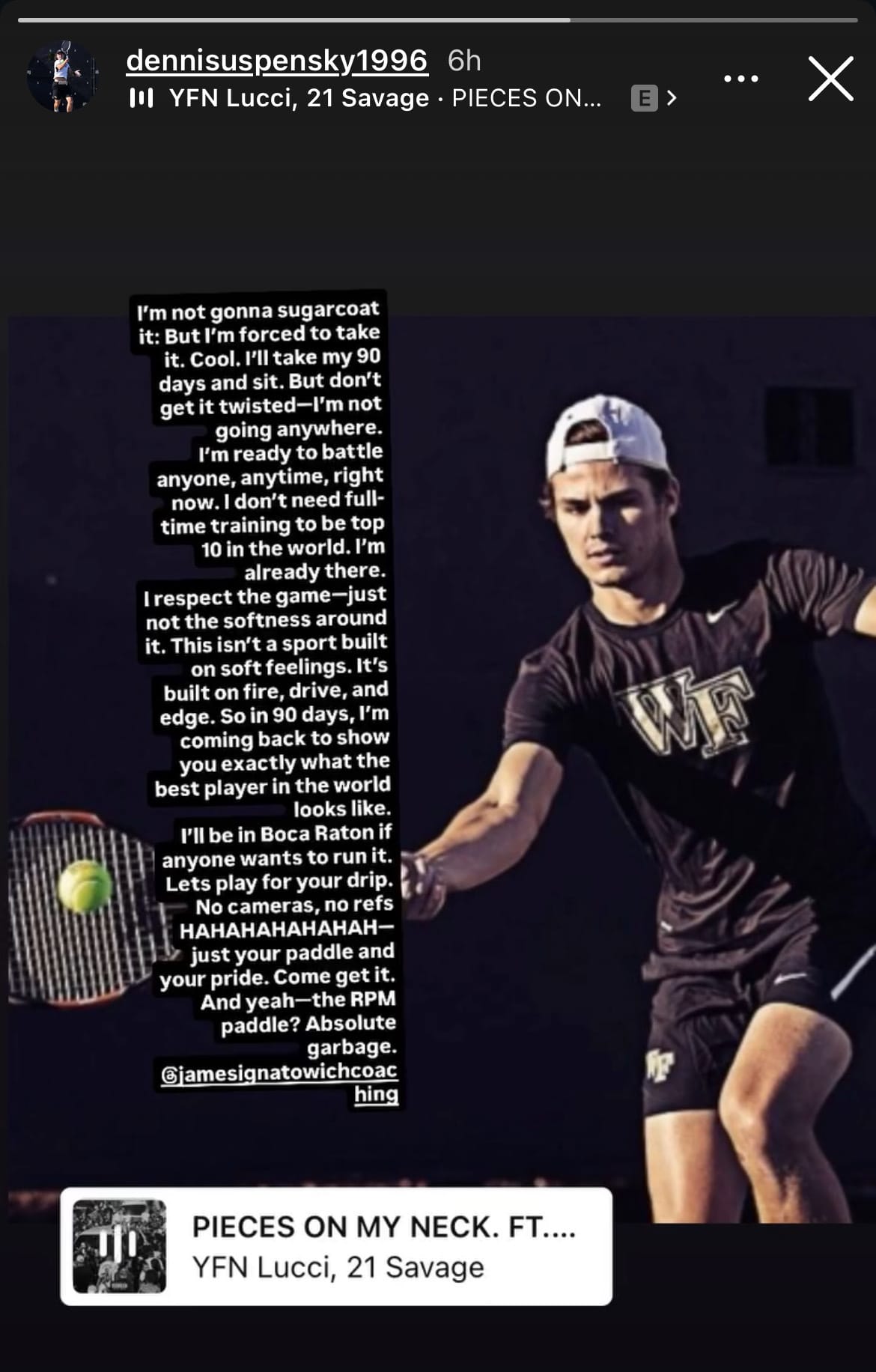 I'll be in Boca Raton if anyone wants to run it. Let's play for your drip. No cameras, no refs HAHAHAHAHAH—just your paddle and your pride. Come get it. And yeah—the RPM paddle? Absolute garbage. @jamesignatowichcoaching