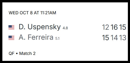 A league official from the UPA confirmed to The Dink that Uspensky has been suspended for 90 days from any tour-related events. That includes the LT Open, which begins October 15 at Life Time Peach Tree Corners in Georgia. Uspensky is currently registered to participate.