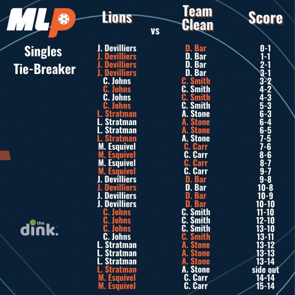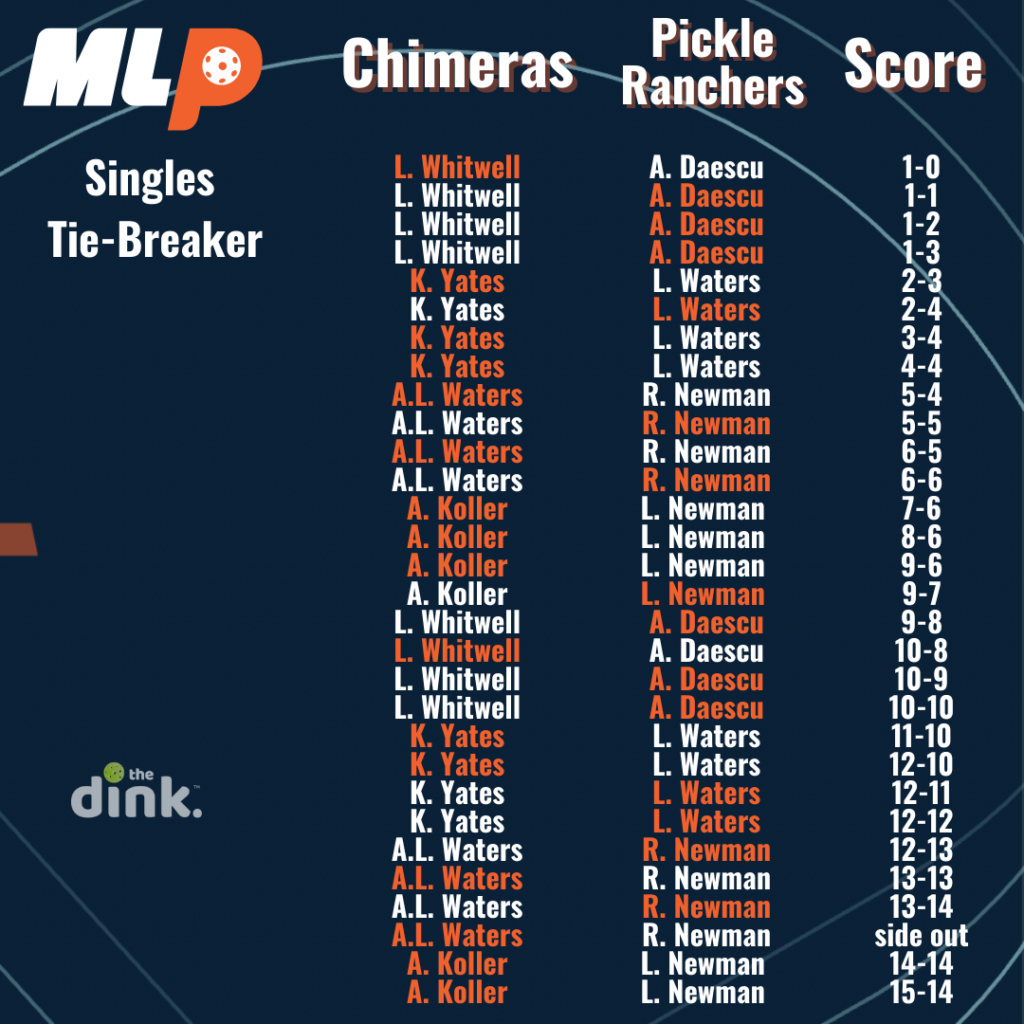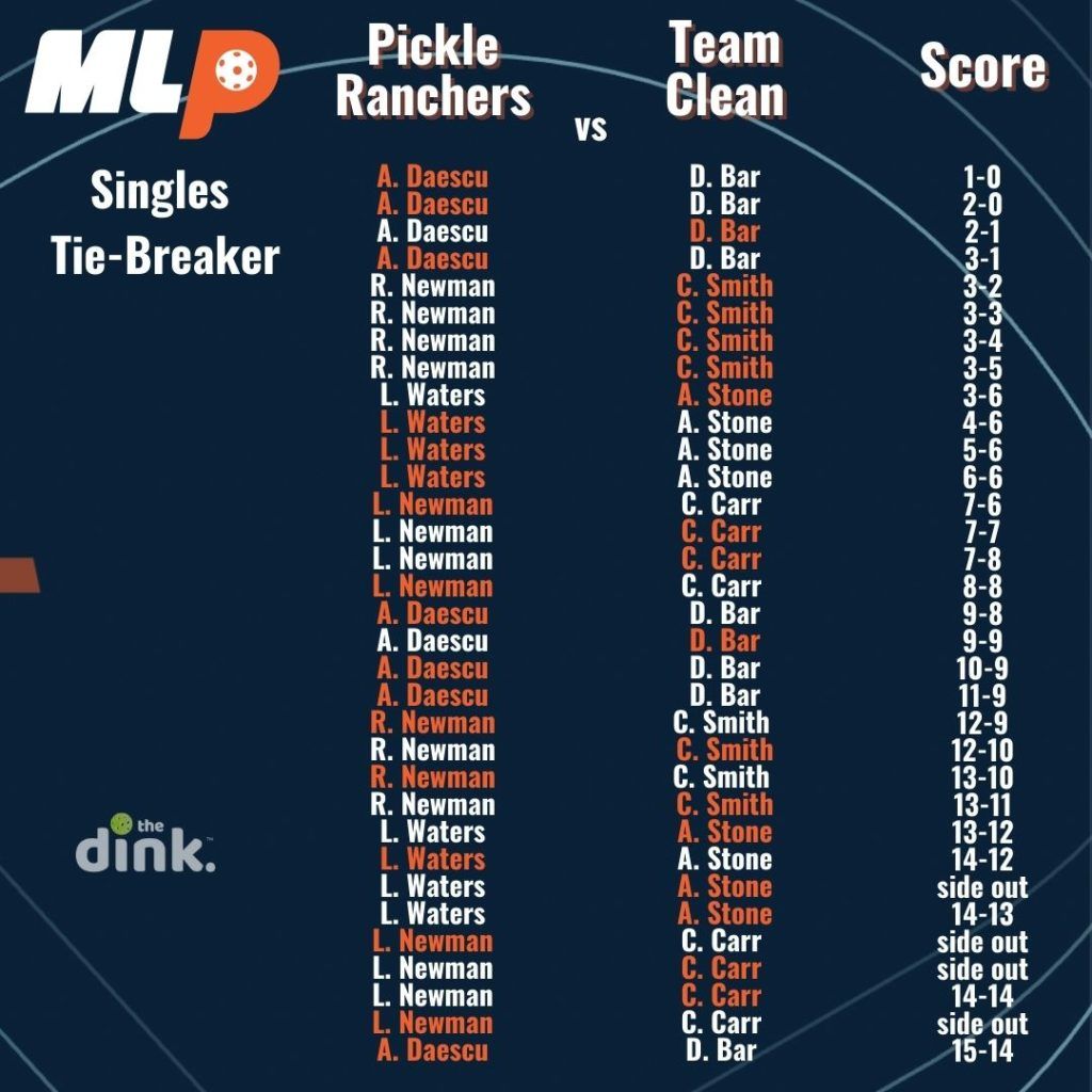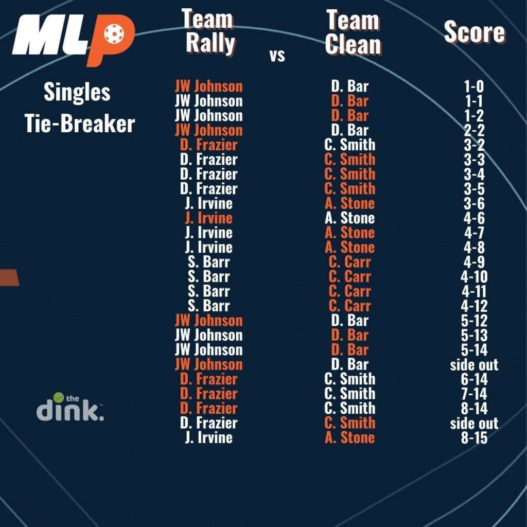 In the first season of Major League pickleball, if teams were tied 2-2 after playing women’s doubles, men’s doubles, and two games of mixed, they would advance to a singles tiebreaker. The tiebreaker used a modified rally scoring system where a point was awarded on every serve until one team reached 14, then it switched back to traditional side-out scoring where only the serving team could score.