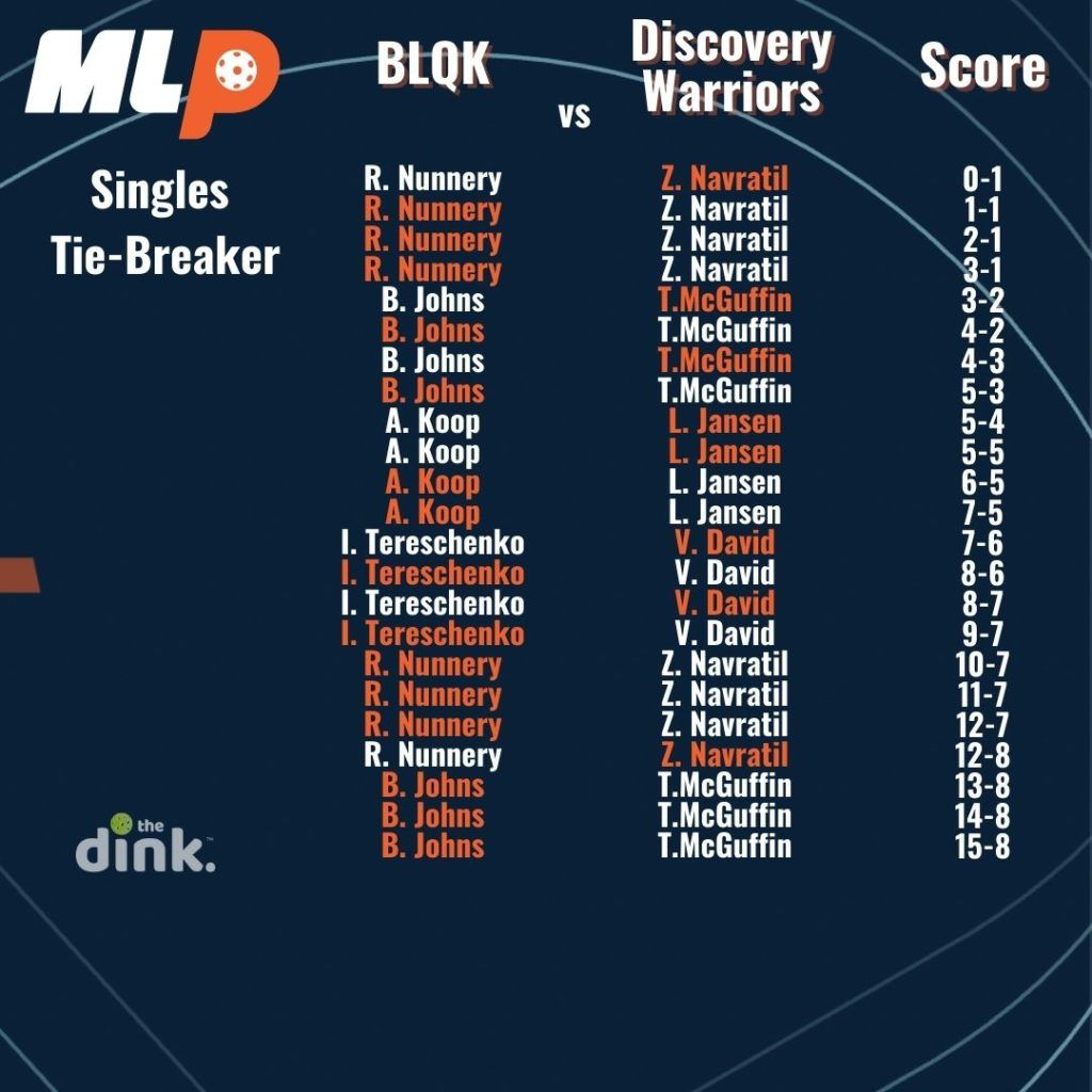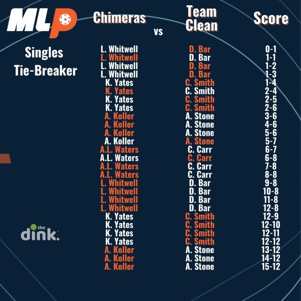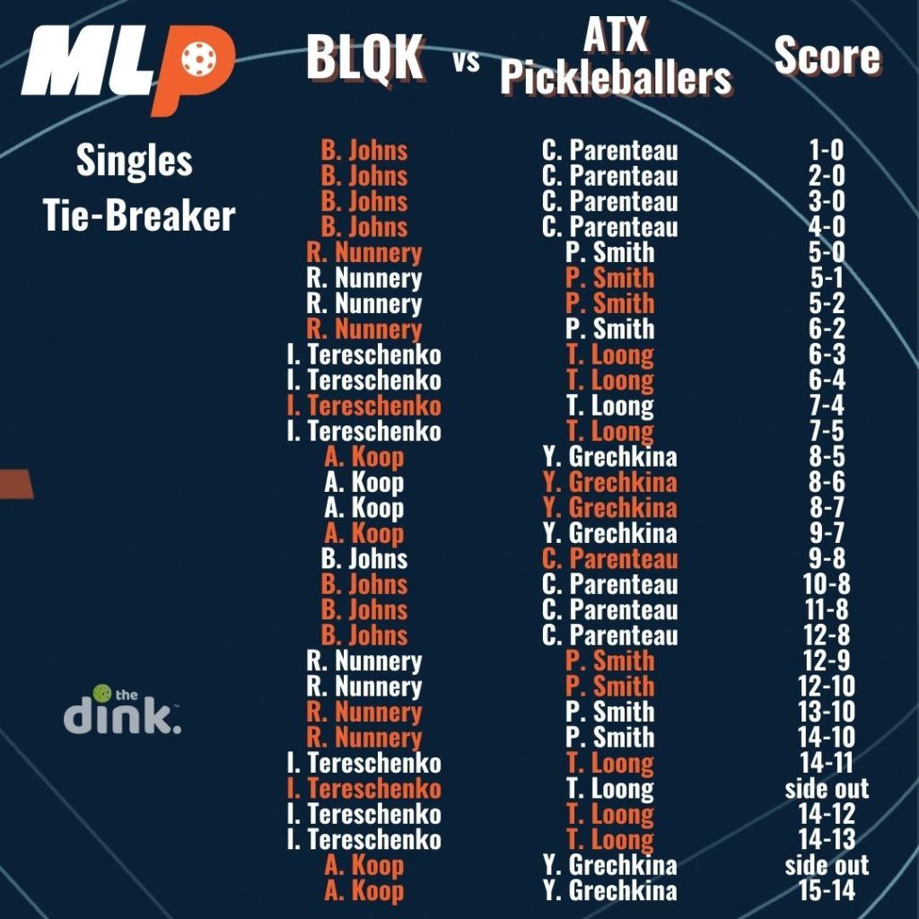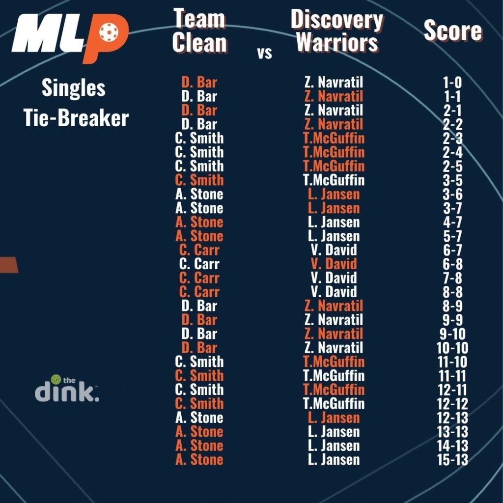 In the first season of Major League pickleball, if teams were tied 2-2 after playing women’s doubles, men’s doubles, and two games of mixed, they would advance to a singles tiebreaker. The tiebreaker used a modified rally scoring system where a point was awarded on every serve until one team reached 14, then it switched back to traditional side-out scoring where only the serving team could score.