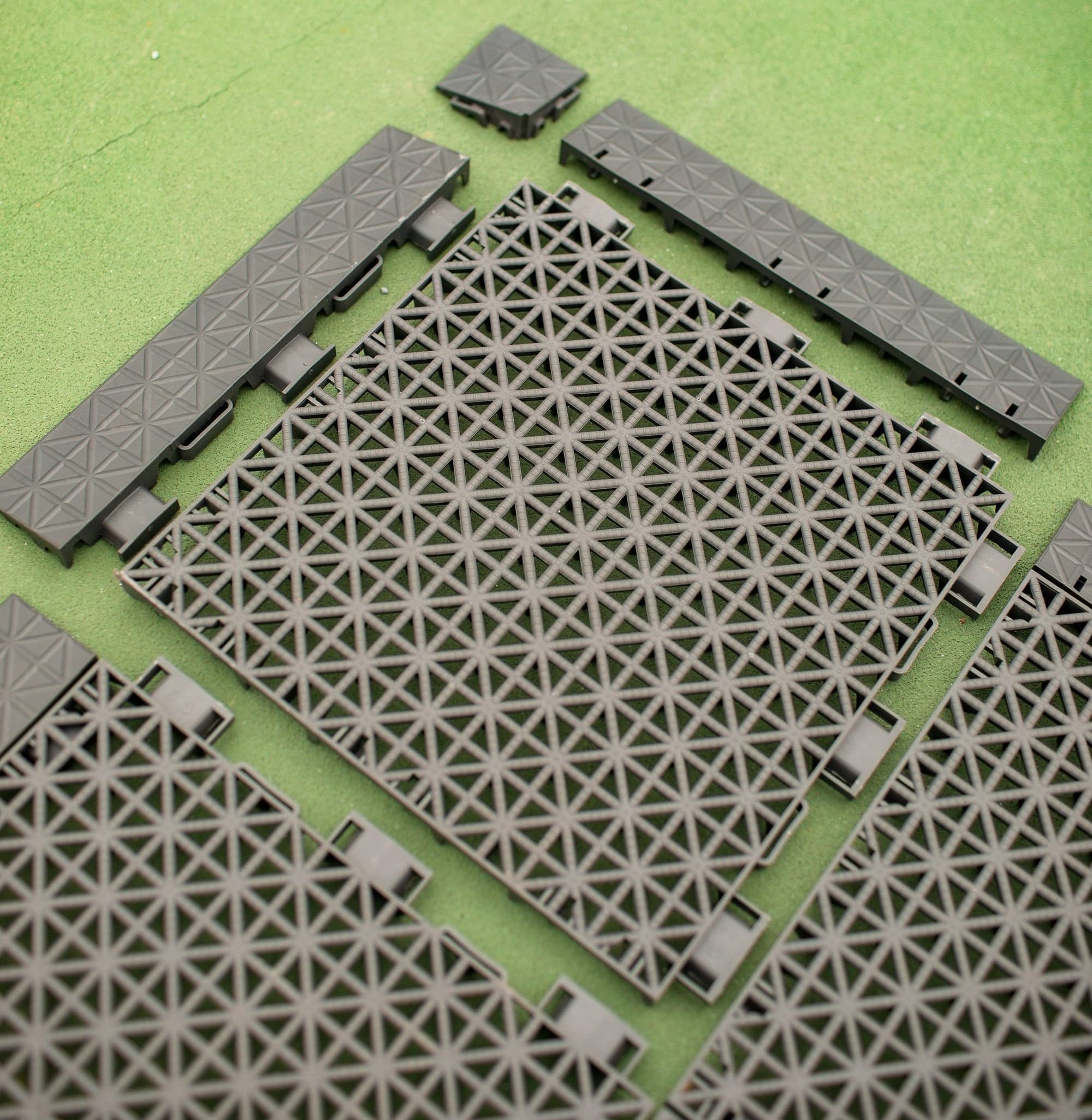 - Modular game court tiles: These tiles are designed for sports surfaces and can be laid over concrete or asphalt. They provide a little more cushion for your joints and give a professional feel to your court.