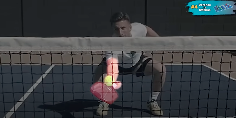 A high-level player recognizes this as an opportunity to either rush to the kitchen (if they are back) or put their paddle in a high attacking position (if they're already at the kitchen line).