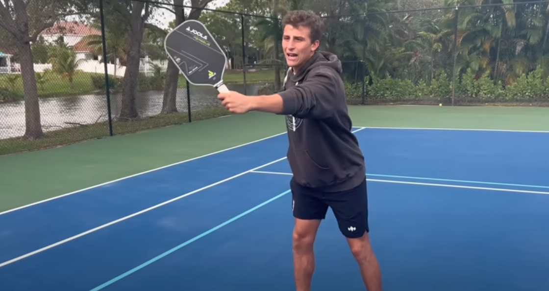 In this image of pickleball pro Matt Wright, you can see this slight pause with his paddle. While you may not know if it will be a speedup or a dink against a pro, against an amateur, this will almost always be a speedup.