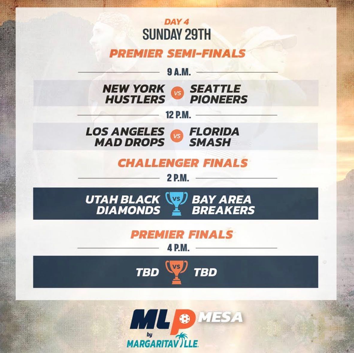 The first Major League Pickleball event of 2023 kicked off Thursday, Jan 27 in Mesa, AZ. Today the Premier Level it's Championship Sunday. The Premier Level semifinals will begin at 9am MT and the Premier Level Final will take place at 4pm MT. Matches can be found on Tennis Channel and Youtube.