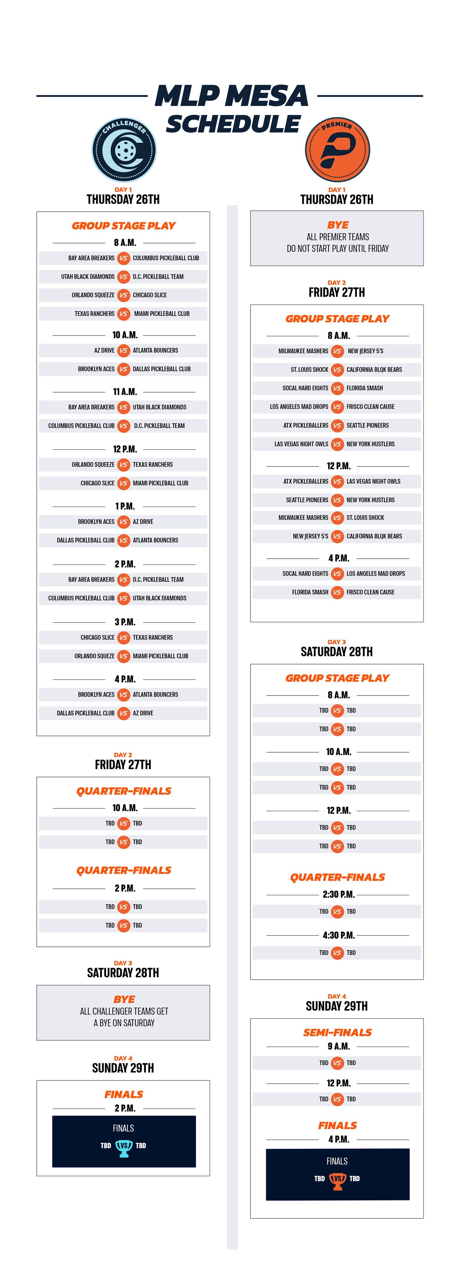 Follow along with the updated schedule from Major League Pickleball. Live stats can updates can be found at majorleaguepickleball.net.