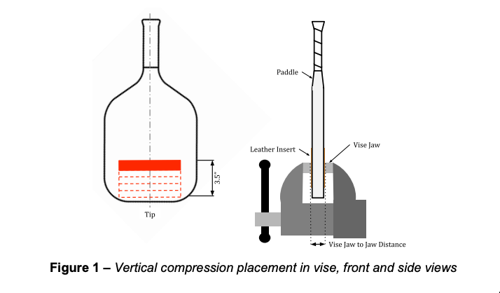 The vice is then clamped at pre-determined intervals across the paddle's face (the "Compression Cycling Method") using very specific levels of force, beginning 3.5 inches from the tip of the paddle, as shown below.