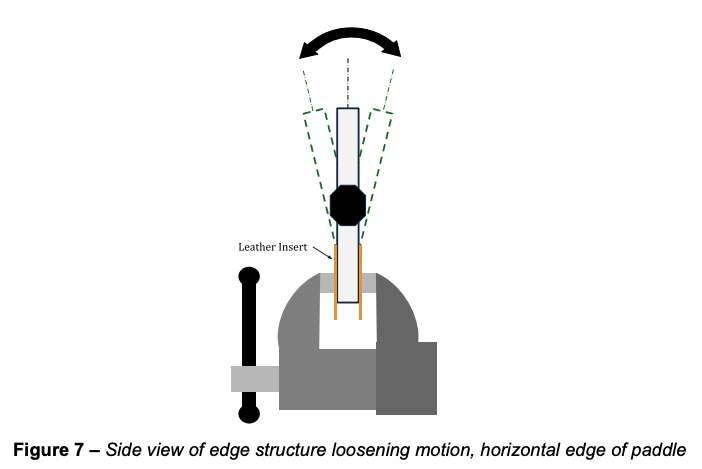 Once complete, an "Edge Cycling Method" applies 10 to 15 degrees of force in both directions to the topmost portion of the paddle to determine if there's been any structural decomposition. This motions is repeated at least 20 times.