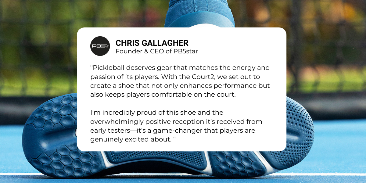 That’s where PB5star comes in. Founded by Chris Gallagher, former CEO and Co-founder of Vionic Shoes, PB5star is on a mission to develop court shoes that maximize mobility and optimize for on-court performance, specifically designed for pickleball players.