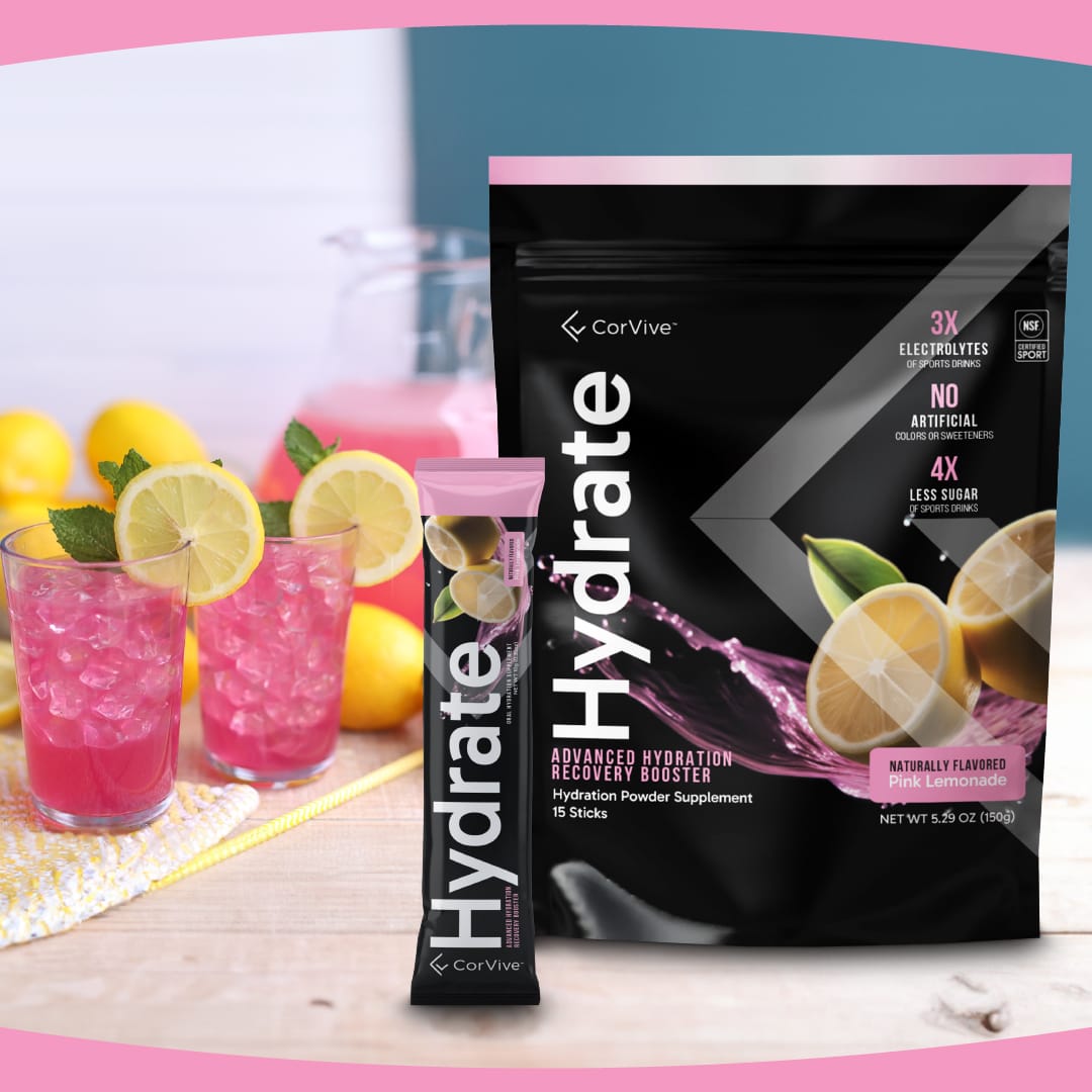Corvive (pronounced Cor-Veev) Cor Hydrate is an advanced electrolyte drink mix designed to ensure optimal hydration, essential for maintaining nerve, muscle, and brain function.