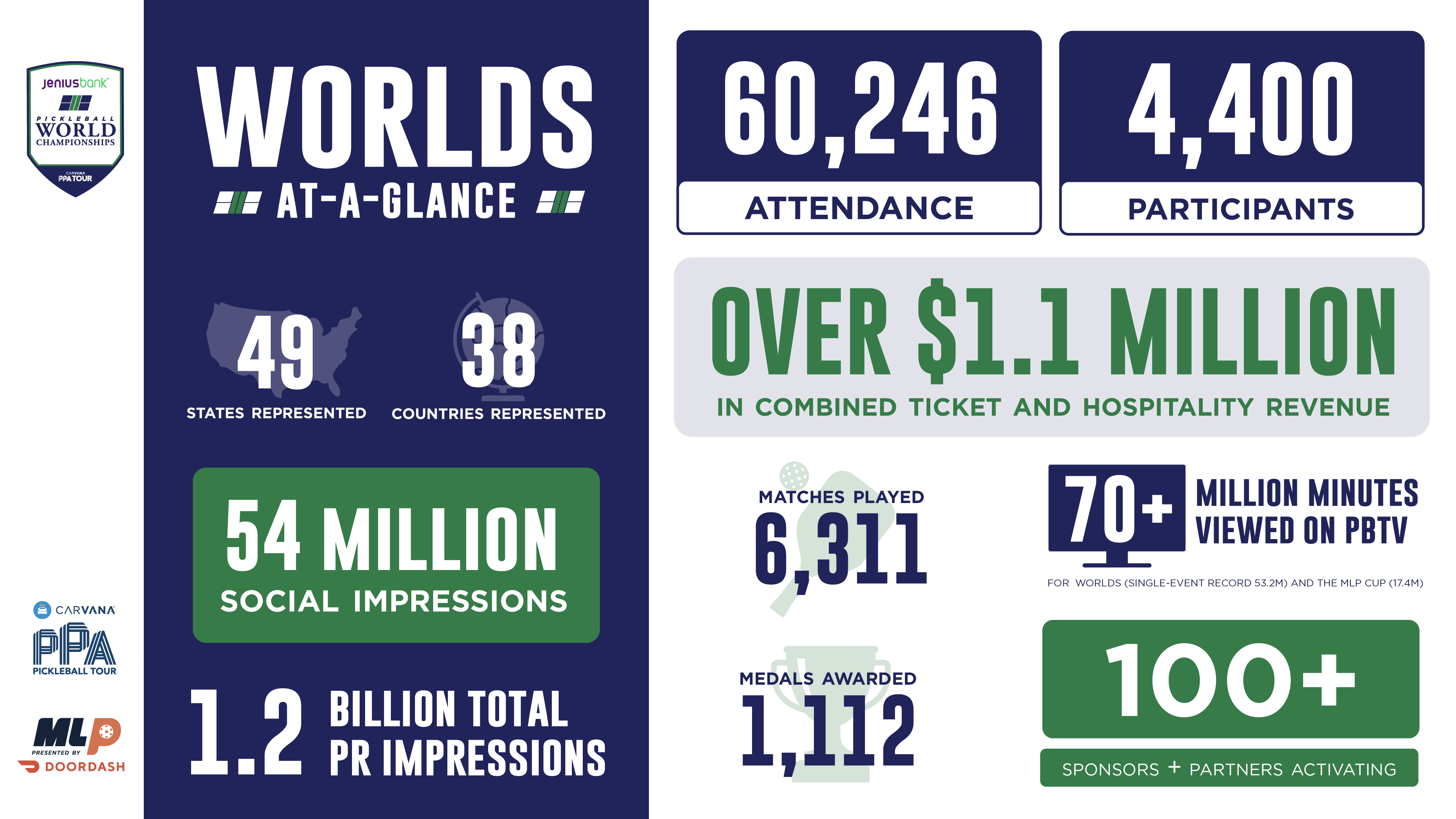 The 2025 Jenius Bank Pickleball World Championship set records across every major metric. Over 60,000 fans attended, more than 4,400 amateur competitors participated, and PickleballTV logged a record 70 million minutes of viewing.