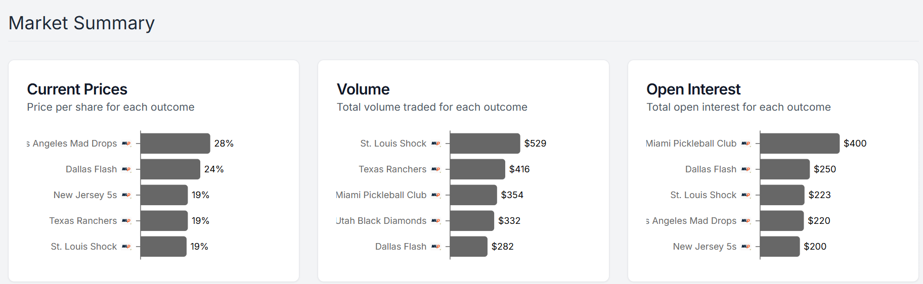 The St. Louis Shock have the most action to win it all, but the cost for purchasing shares in the LA Mad Drops is the highest right now. All very intriguing stuff.