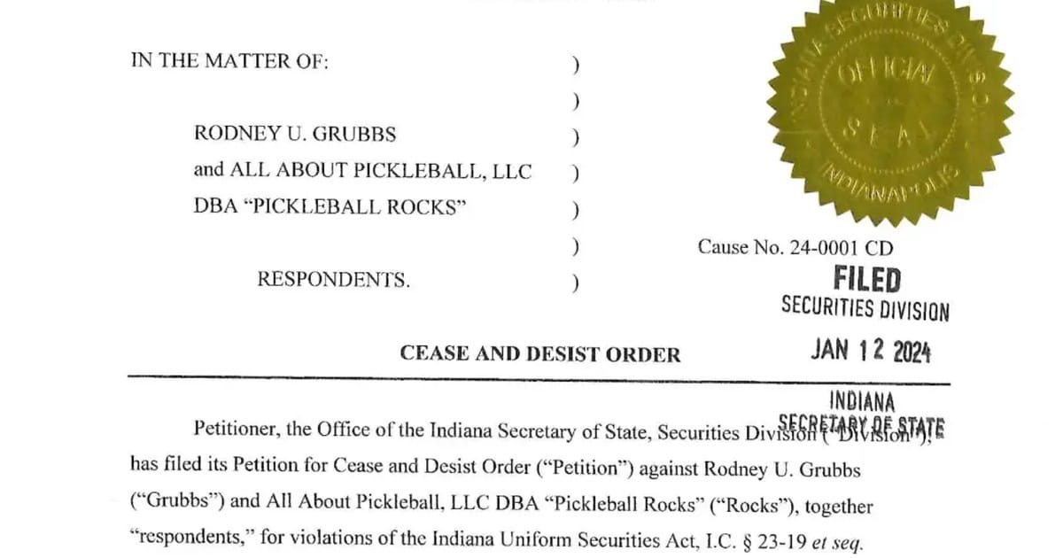 The investigation is ongoing. Earlier this year, a group of creditors forced Grubbs into involuntary bankruptcy after a two-plus-hour hearing in federal bankruptcy court in Indianapolis. He closed his Pickleball Rocks store and stopped attending tournaments. In court filings, Grubbs claimed assets of $1.6 million.