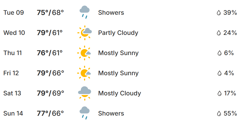 Rain looks like it could cause issues on Tuesday and Wednesday. Additionally, Sunday is looking like rain. Be on the lookout for weather delays and/or changing of schedule to try to avoid the rain.