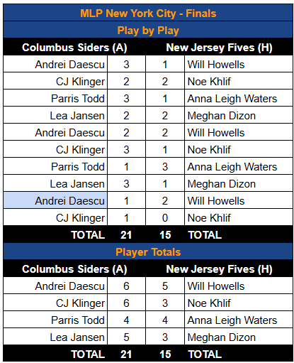 In the second semifinal, The #3 New Jersey Fives took out the #6 LA Mad Drops in two quick matches. The storylines headed into the weekend were surrounding Ben Johns and Anna Leigh Waters facing off against each other in a head-to-head showdown.