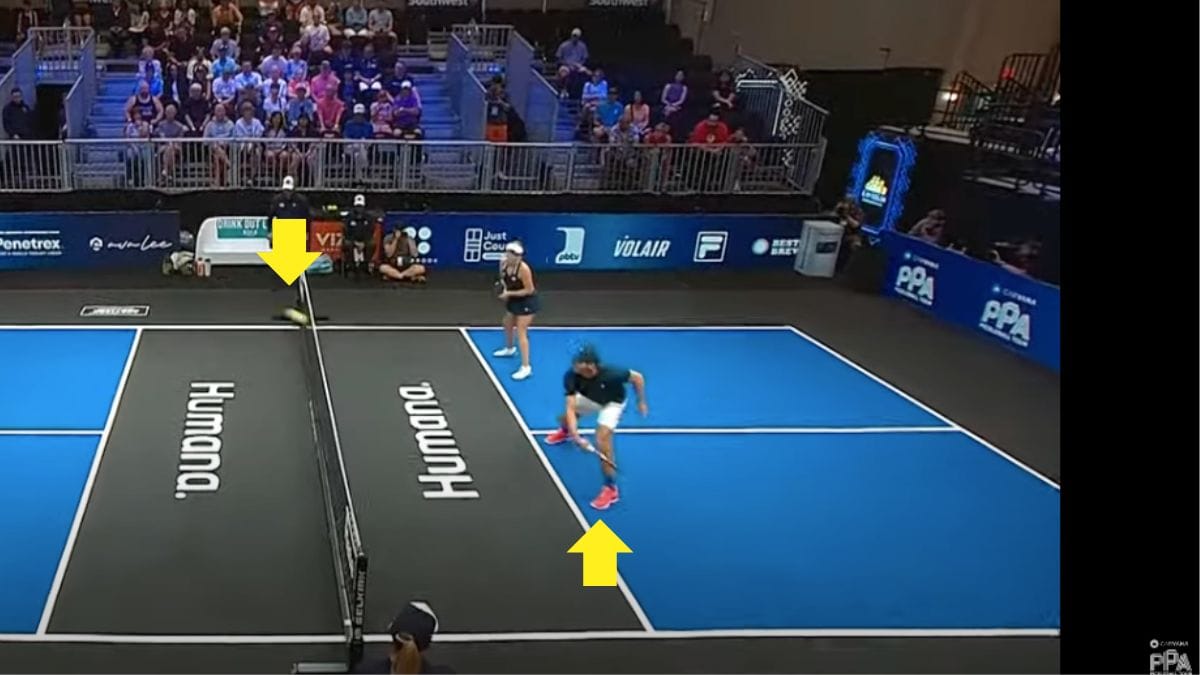 Notice (again) where the ball is – it's almost to her body and her paddle still isn't in its prime position. Her paddle is down, her arms are tucked, and there's very little chance of making solid contact on this ball.