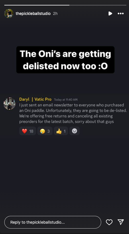 However, given the changing landscape of the sport as well as newly adopted USAP testing methods, we regret to inform you that our Oni Paddles are scheduled to be de-listed by USAP. As a result of this development, we will be canceling all existing pre-orders for Oni Paddles. All preorders will be refunded to your original payment method...